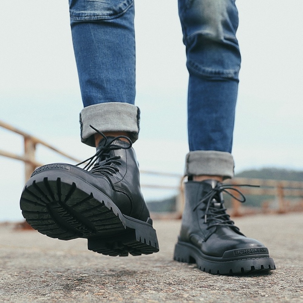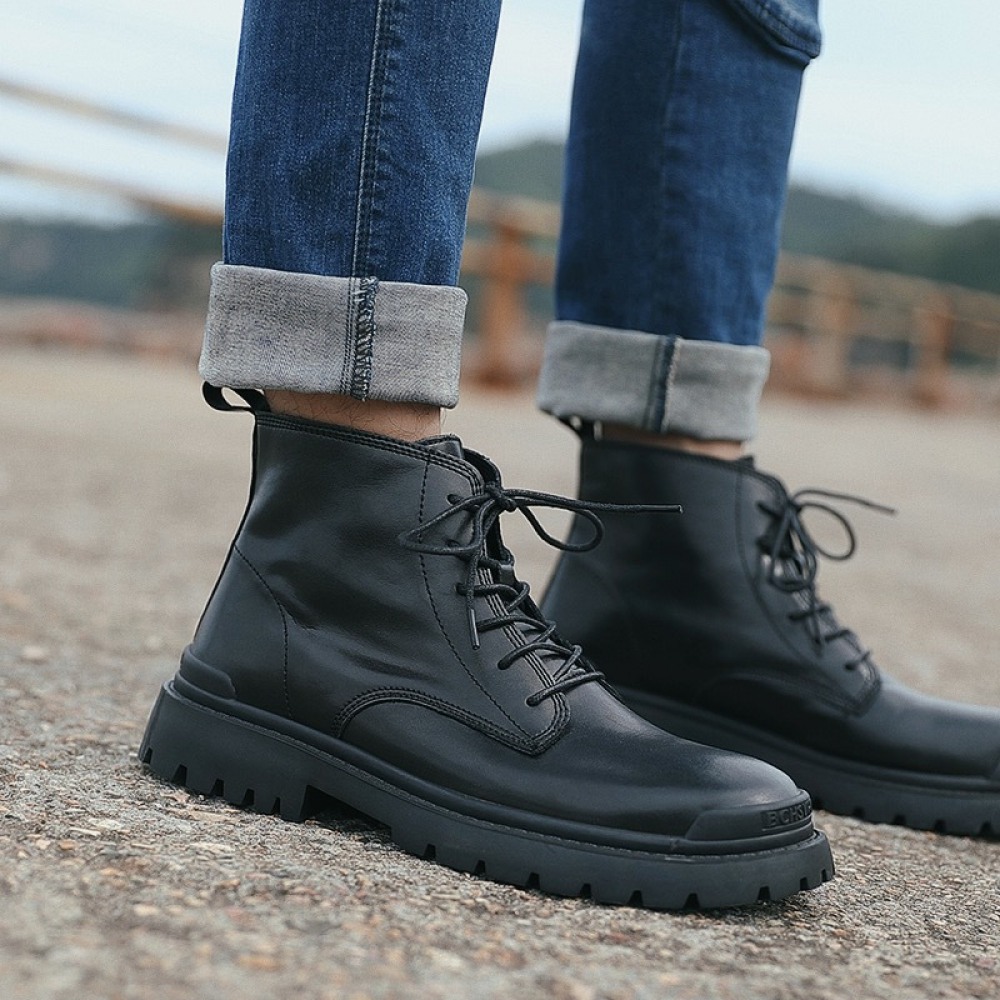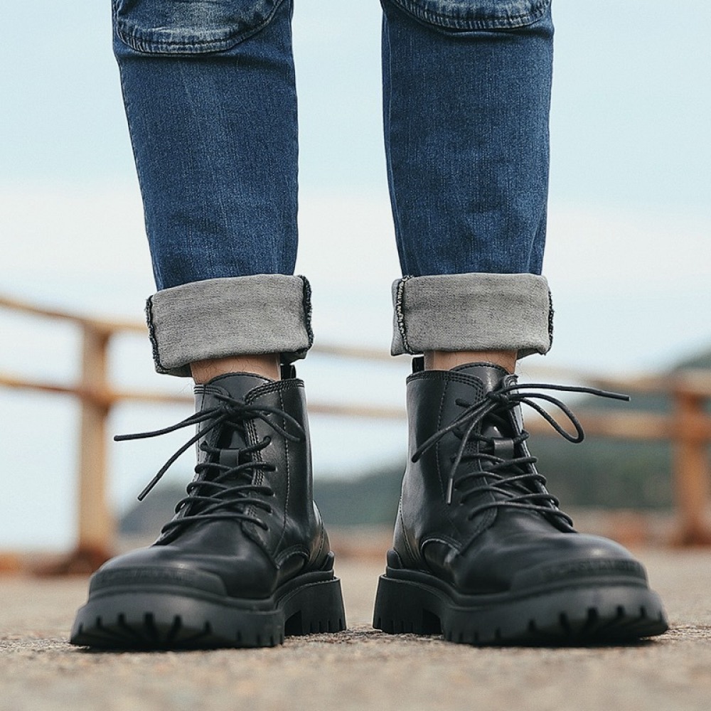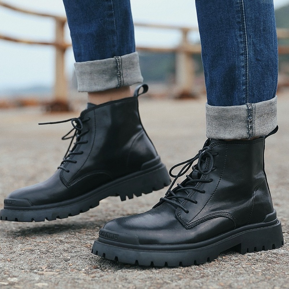 Men's Leather Mid-Top Boots High-Top Casual Shoes Increased Martin Boots Black